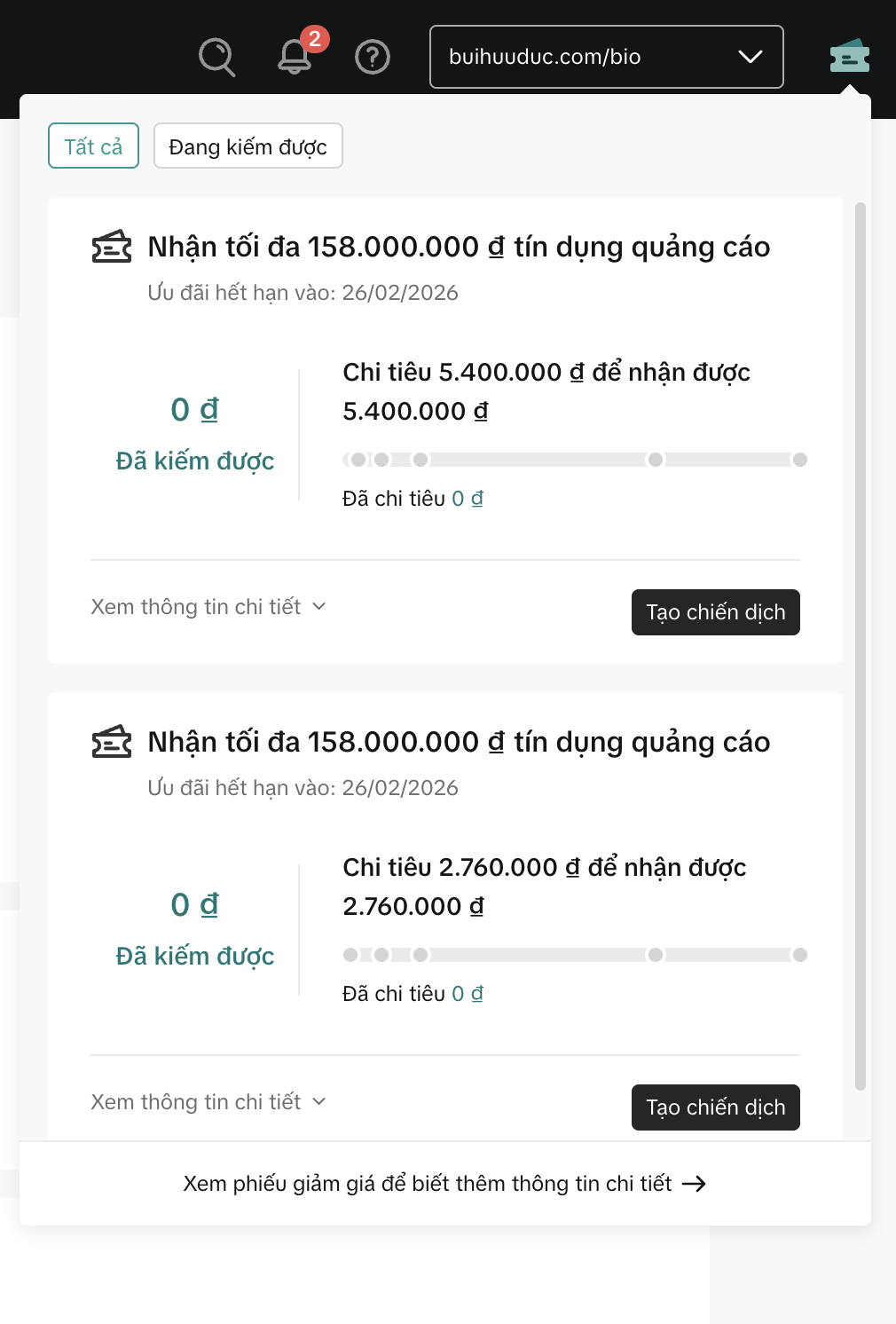 Nếu bạn đã đăng ký thông qua Liên kết chinh thức từ đối tác TikTok và số điện thoại của bạn đảm bảo chưa tạo TKQC TikTik, bạn sẽ thấy chương trình tín dụng quảng cáo (lên đến 158 triệu VND) được hiển thị ở góc trên bên phải bảng điều khiển của bạn.